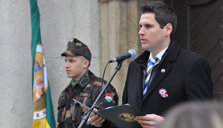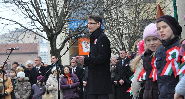 A Városház téren rendezett ünnepi megemlékezésen dr. Molnár Krisztián, Fejér Megyei Közgyűlés elnöke kiemelte, hogy ha ma 48 forradalma előtt tisztelgünk, nem csupán a szuverén állam mellett teszünk hitet, hanem a haladás mellett is. „Önöknek, nekünk, gyermekeinknek 1989 hozta el végre az új, szabad köztársaságot, melyet az 1848-ban megszülető polgári Magyarország szellemi örökösének tekinthetünk. Megszenvedte ugyan a nemzet a változást, fájdalmas volt a szembesülés az ország valós gazdasági állapotával, de mára már ebben is előrelépett.” – hangsúlyozta Molnár Krisztián, aki szerint a 48-as szabadságharc máig továbbélő eszméi erős talapzatot kínálnak minden magyar tenni vágyásának. „Tennivalónak pedig ma sem vagyunk híján. Hajtsunk hát fejet nagyszerű eleink emléke előtt és próbáljunk a magunk korában méltóak lenni hozzájuk, építsük tovább a magyar nemzet független és erős Magyarországát.” – zárta ünnepi beszédét a Fejér Megyei Közgyűlés elnöke.
