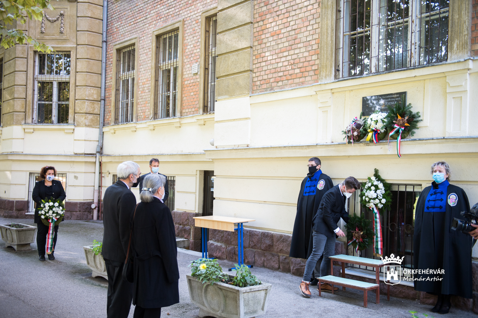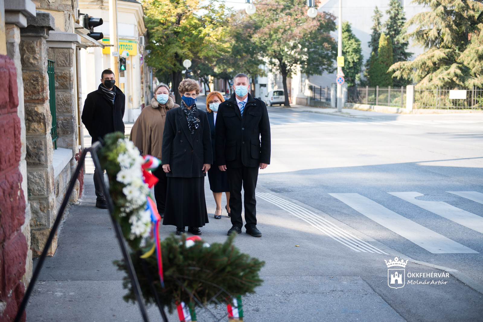 Néma főhajtással tisztelegett Dr. Horváth Miklósné önkormányzati képviselő, Bihácsi István alelnök, illetve a Székesfehérvári SZC Bugát Pál Technikum és Jáky József Technikum igazgatói, Matikáné Tóth Éva és Dr. Oroszné Stefánkó Éva a Deák Ferenc utcában. A Fejér Megyei Rendőr-főkapitányság épületén 1993-ban felavatott emléktábla a szabadságharcban 1956. október 24-én, a szovjet páncélos gyilkos sortűzben elesetteknek, Bernáth Katalinnak, Csányi Évának, Gumpl Józsefnek, Jóvári Imrének, Kardos Pálnak, illetve Versegi Jenő Bélának állít emléket.
