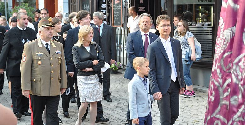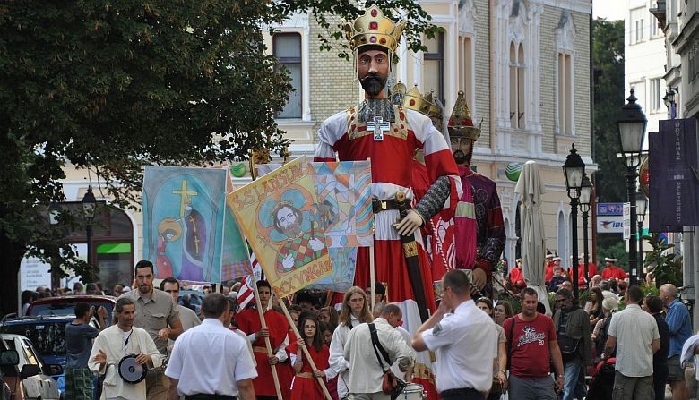 Idén egy történelmi felvonulással is gazdagodott az augusztus 20-i ünnepi programok sora Székesfehérváron. Az óriásbábok a Koronás Parktól indultak, majd a dobosokkal, hagyományőrző csoportokkal és az egyre népesebb kísérőközönséggel együtt a Belvároson át egészen a Szent István térig vonultak. A színes forgataghoz a Díszközgyűlésre érkező vendégek, a megye, a város és a közhivatalok vezetői is csatlakoztak.