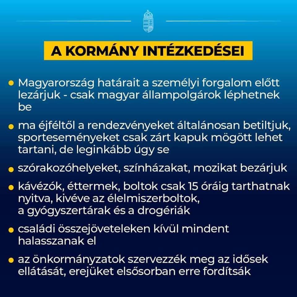 A miniszterelnök bejelentette, hogy Magyarország határait lezárják, csak magyar állampolgárok léphetnek az ország területére. A rendezvényeket éjféltől betiltják. A szórakozóhelyeket, mozikat bezárják. Az éttermek, kávézók, üzletek 15 óráig lehetnek nyitva, kivéve az élelmiszerüzleteket, patikákat és drogériákat.