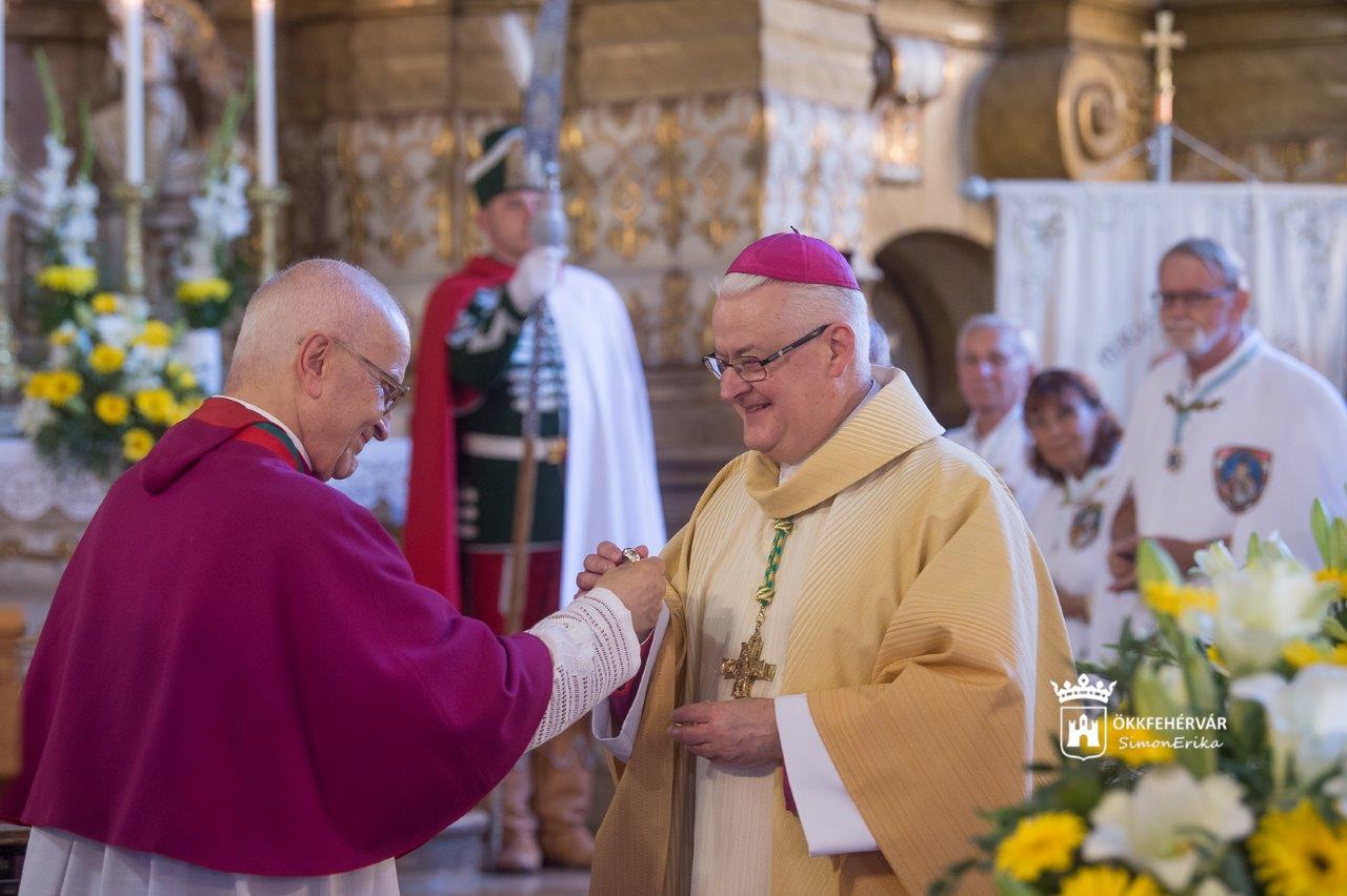 Meghitt, ünnepi pillanatokkal kezdődött a fogadalmi szentmise; Mons. Prof. DDr. Franz Kaspar kanonok, apostoli pronotárius, prelátus, a limburgi egyházmegye volt helynöke - akit pontosan tíz esztendővel ezelőtt, a fogadalmi ünnepen a székesfehérvári káptalan címzetes kanonokjává nevezett ki Spányi Antal - egy egészen különleges püspöki gyűrűt ajándékozott a főpásztornak.
