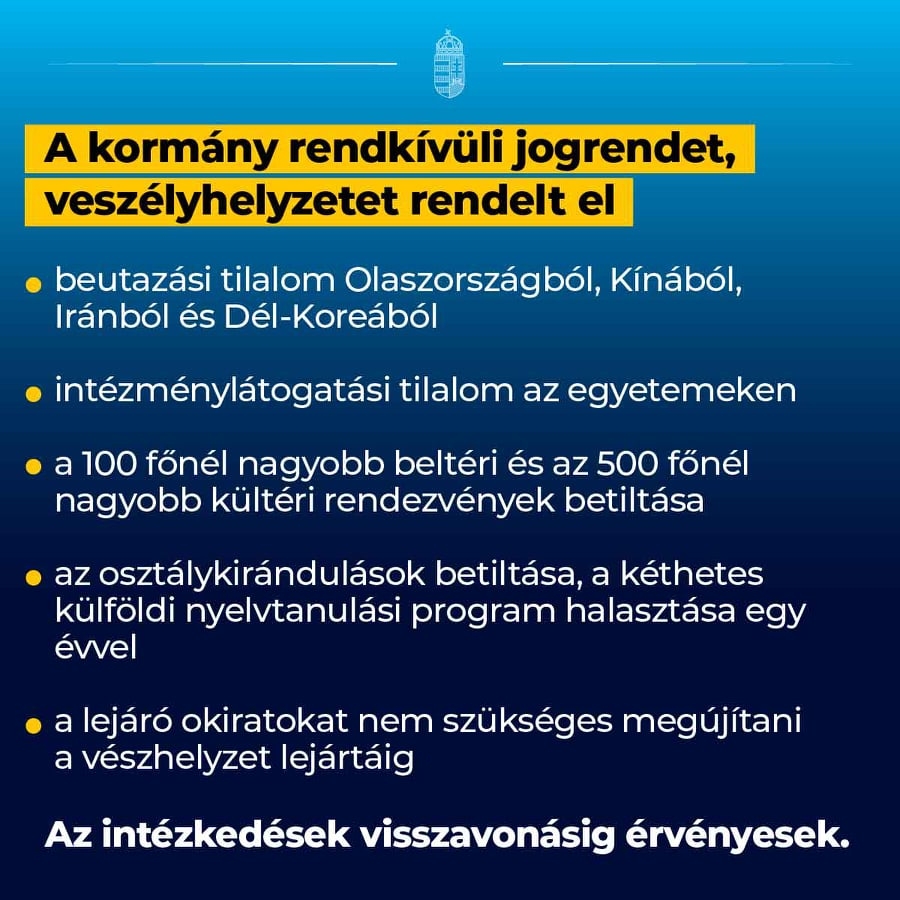 Beutazási tilalmat rendel el a kormány a koronavírus terjedése elleni intézkedések részeként az Olaszországból, Kínából, Dél-Koreából és Iránból érkezőkre, kivéve, ha magyar állampolgárok.